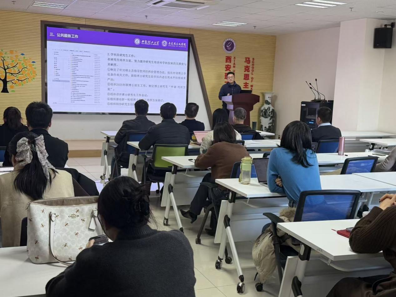 本次汇报会,根据人事处提出的全面了解青年教师工作情况,促进青年教师成长发展的要求。参会青年教师通过PPT模式,分别从教学、科研、公共服务及存在的问题与不足等四个方面汇报2025年度工作情况,并对2026年度工作进行科学规划与展望,尤其是对国家社科基金等科研申报工作提出个人具体规划。院领导及各教研室主任结合实际工作表现,现场逐一点评,肯定成绩,指出不足,并提出改进意见。