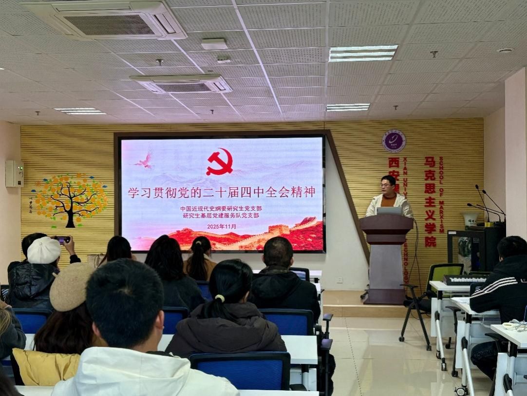 为深入学习贯彻党的最新理论成果,提升支部党员的政治素养和理论水平,2025年11月20日,中国近现代史纲要研究生党支部、研究生基层党建服务队党支部在综南楼911会议室组织召开11月主题党日活动,围绕党的二十届四中全会精神和《求是》杂志发表的习近平总书记重要文章《因地制宜发展新质生产力》开展专题学习。