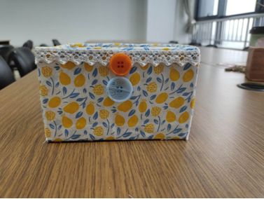 该置物盒是用快递纸盒、碎花布、纽扣、丝带所制作。首先, 修剪快递盒,剪掉多余的部分然后用碎花布粘合,用纽扣和丝带做装饰,废物改造就完成了。网购时代,同学们每天产生很多快递垃圾,不如变废为宝,共同营造良好的校园环境,树立勤俭节约的良好品德。