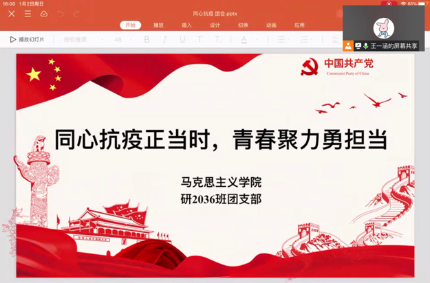 1月2日下午,suncitygroup太阳成集团研2036班团支部以“同心抗疫正当时,青春聚力勇担当”为主题,线上开展主题团日活动。本次活动分为宣传抗“疫”和分享抗“疫”两个部分,由团支书王一涵主持,支部成员分享学习感悟并进行热烈讨论。