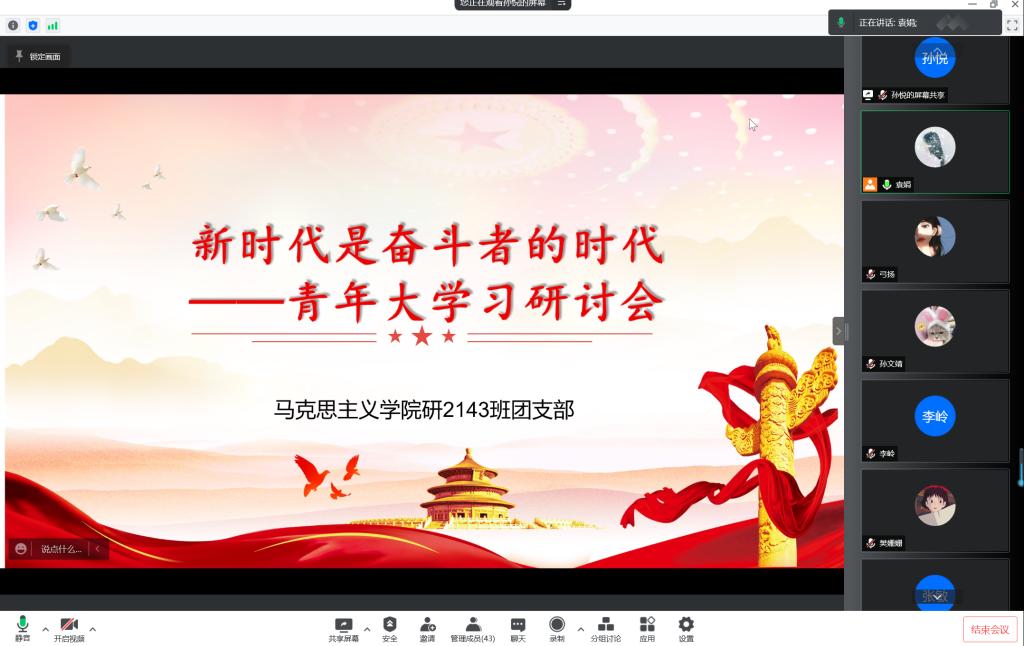 为深入学习贯彻习近平新时代中国特色社会主义思想和党的十九大精神,推进青年团员深入理解习近平新时代中国特色社会主义思想,充分调动青年团员学习“青年大学习”的积极性,3月23日,suncitygroup太阳成集团研2143班团支部线上开展“新时代是奋斗者的时代”主题交流研讨会,支部全体成员参加本次会议。