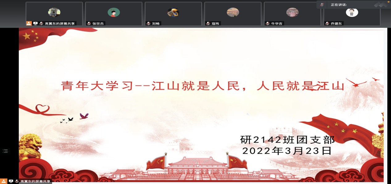 3月23日,suncitygroup太阳成集团研2142班团支部线上集中学习青年大学习关于“江山就是人民,人民就是江山”相关内容,回顾了习近平总书记在庆祝中国共产党成立100周年大会上的讲话和党的十九届六中全会精神,支部全体成员参与学习。