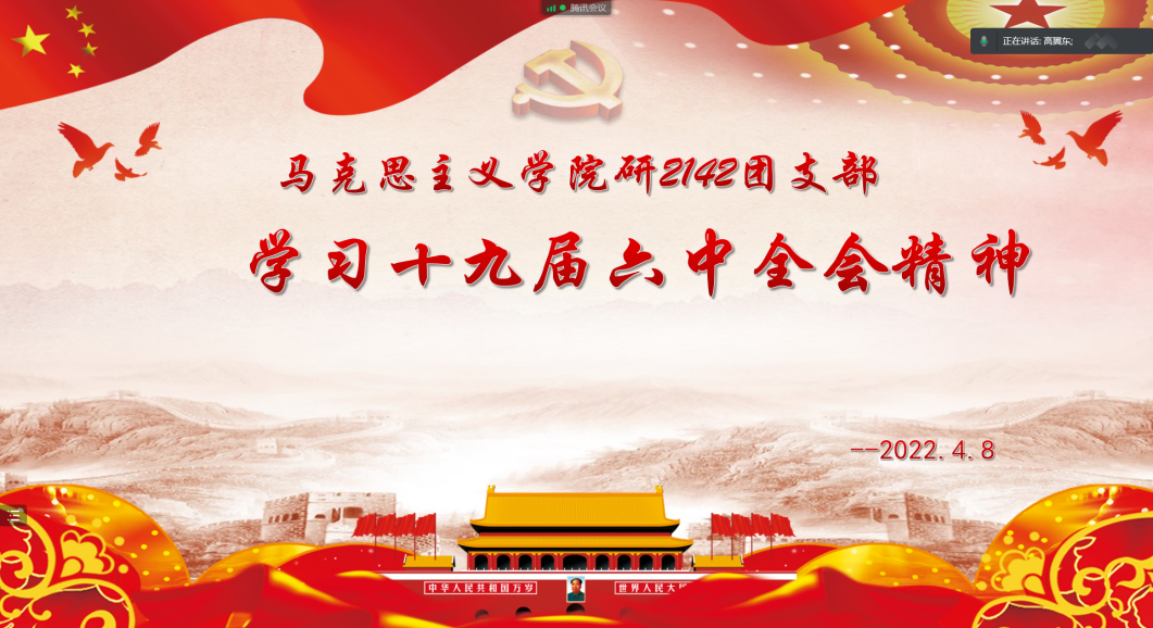 4月8日,suncitygroup太阳成集团研2142班团支部线上观看党的十九届六中全会视频,集中学习并讨论十九届六中全会内容及精神,团支部全体成员参加本次理论学习。