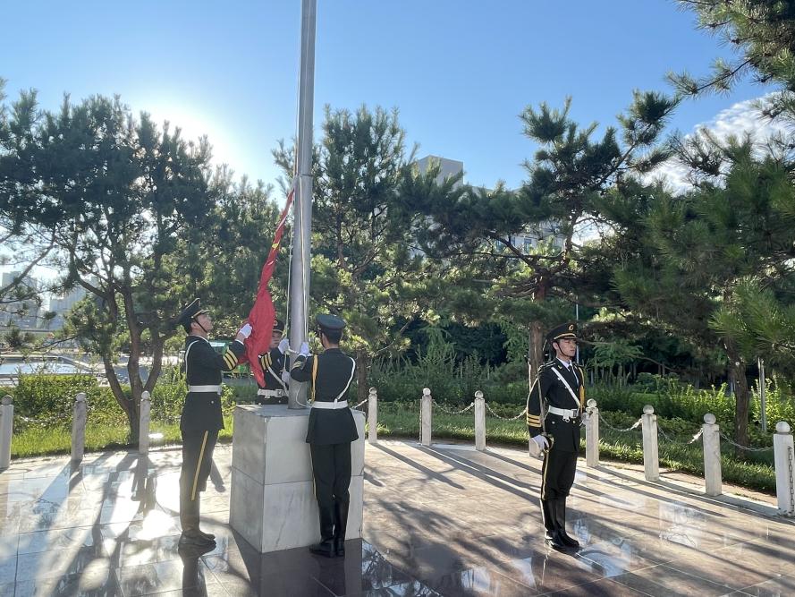 伴随着雄壮的国歌和东方第一缕朝霞,五星红旗冉冉升起,在场师生一齐向国旗致注目礼并齐唱国歌,诚挚而肃穆地目送国旗缓缓上升。