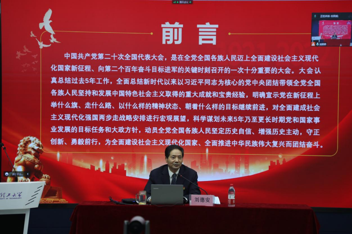 刘德安结合自身学习党的二十大精神的心得体会,以《深刻认识党的二十大的重大意义 在全面建设社会主义现代化国家新征程上书写青春新篇章》为题做主题报告,深刻阐述了中国共产党成立100年来走过的艰辛历程和取得的伟大成就,从党的二十大的大会主题、过去五年工作和新时代十年的伟大变革、开辟马克思主义中国化的时代新境界、新时代新征程中国共产党的使命和任务等十五个方面传达了党的二十大精神。并结合自身学习工作经历,勉励广大青年一是要坚定理想信念,勇担历史使命;二是要努力学习实践,练就过硬本领;三是要不断修身立德,涵养人格力量;四是要奋力担当作为,矢志艰苦奋斗;五是要坚持开拓创新,贡献青春力量,一步一个脚印地把党的二十大作出的重大决策部署付诸行动、见之于成效。