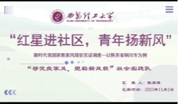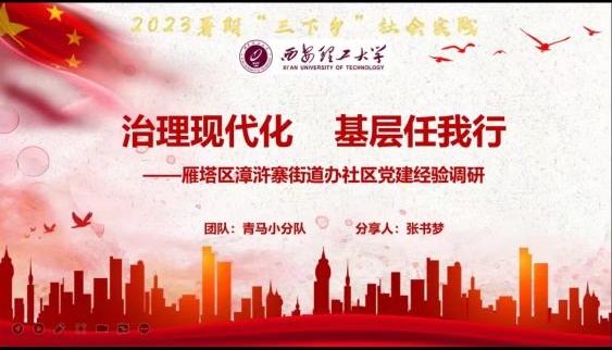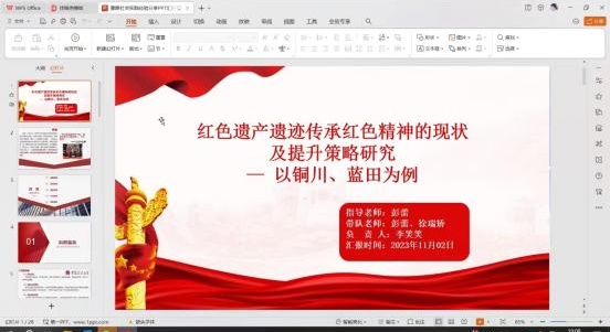 随后,公司今年组队的8支团队代表张书梦、封紫阳等同学分别以《以红色遗产遗迹为依托传承红色精神-以陕西省铜川市、蓝田县等地为例》《新时代我国家教家风现状时政调查-以陕西省铜川市为例》《陕西长征文物保护与利用》《红色文化赋能乡村文旅智慧发展》《书香润童心-将农家书屋打造成儿童的“精神乐园”》《向“数”而“兴”:农村数字党建发展现状调查及提升策略研究》《基层治理现代化视角下社区党建治理模式与经验研究-基于雁塔区漳浒寨街道办社区研究》等为题,从选题立意、实践过程和报告撰写、心得体会等四个方面进行了详细的介绍。