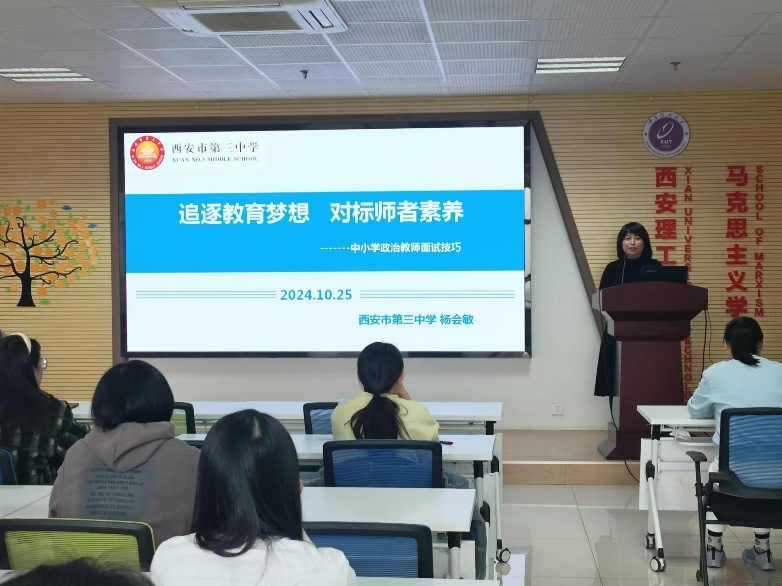 为帮助公司毕业生进一步提升就业竞争力,熟悉中小学思政课教师的岗位职责和职业发展路径,10月25日,公司特别邀请来自西安市第三中学的陕西省首届基础公司产品指导委员会思想政治(道德与法治)教学指导专委会委员、西安市教学能手杨会敏老师,在综南楼911报告厅为毕业生进行中小学思政课教师笔试与面试技巧辅导。专题讲座由公司党委副书记陈文林老师主持,毕业班辅导员和毕业生参加本次活动。