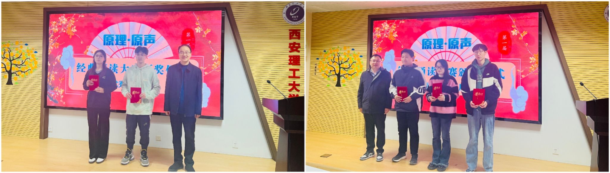 在大赛颁奖仪式暨优秀作品展播现场,首先由马院张锐书记致辞,他谈到了老员工诵读马列经典著作的重要性,高度肯定了此次活动的意义,并预祝活动圆满成功。接着,原理教研室彭蕾副主任介绍大赛的流程。在她的宣布声中,颁奖仪式在掌声中拉开帷幕。张锐、陈文林、朱鸿亮、彭蕾以及侯彦峰、马蕾为获奖团队颁奖。