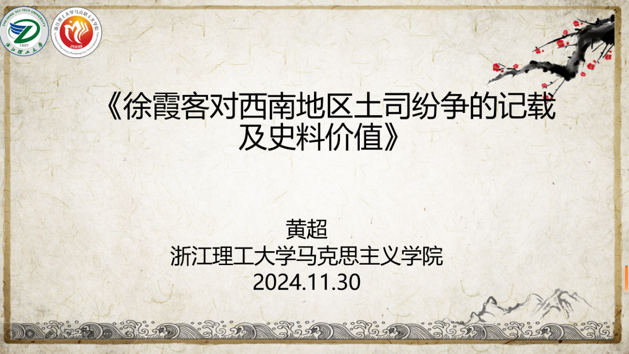 黄超老师以《徐霞客对西南地区土司纷争的记载及史料价值》为主题,为大家进行专题理论讲座。黄老师从《徐霞客游记》的文学价值、地理学价值和文化价值入手,引出为何研究土司纷争记载的史料价值这一论题,详细阐述了明代西南地区的空间范围及土司纷争的概念内涵、《徐霞客游记》关于明代西南地区土司纷争记载情况梳理以及《徐霞客游记》中明代西南地区土司纷争的史料价值。