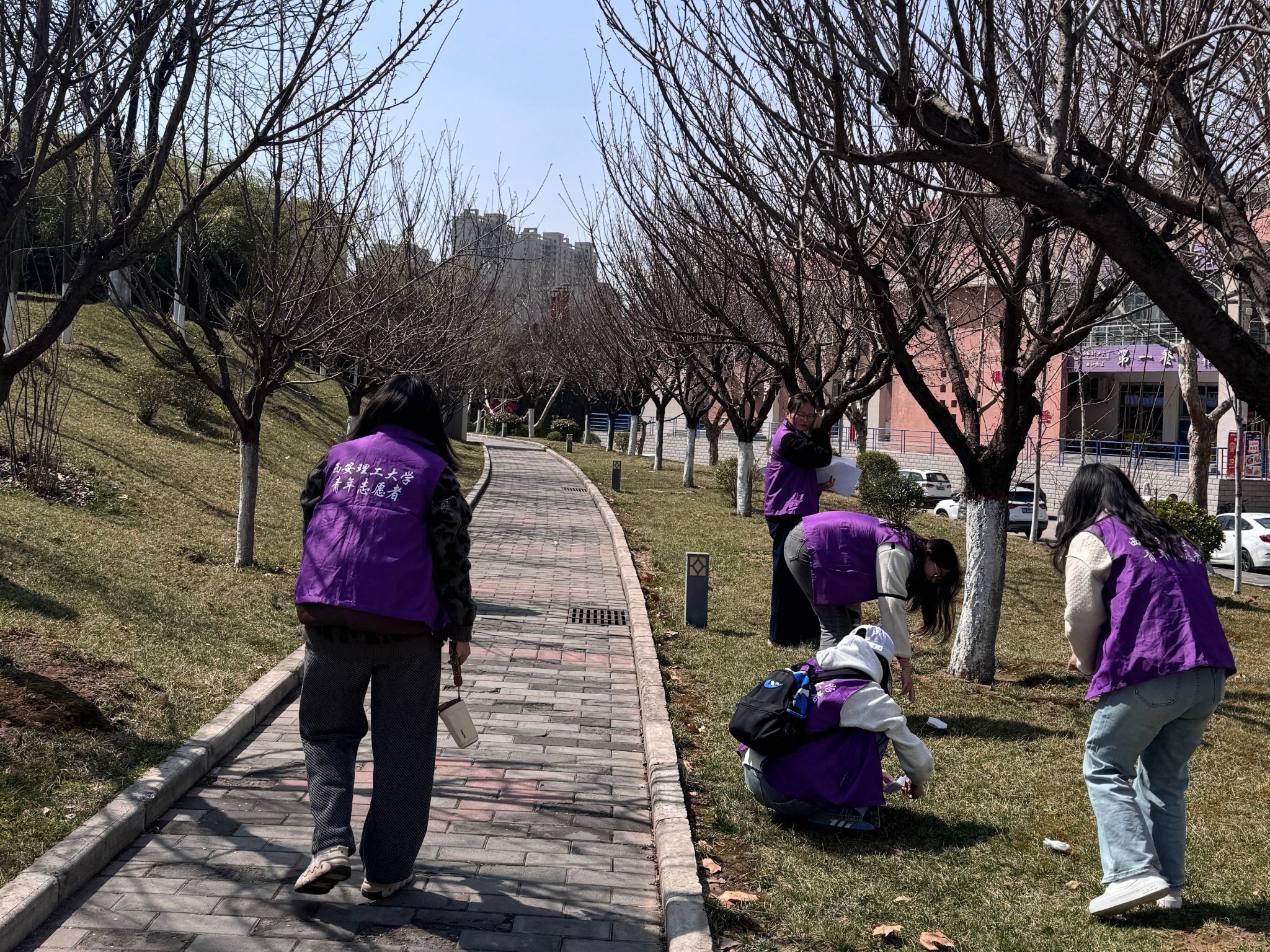 3月14日上午,研241102班的团员们积极响应“保护环境,人人有责”的号召,开展了一场以“环保雷锋行,青春展风采”为主题的校园环保志愿服务活动。同学们身着统一的紫色志愿者服装,手持清洁工具,分成若干小组,开始了校园环境清理工作。一组同学负责清理校园主干道两侧的垃圾,另一组则专注于绿化带的杂物清理。在清理过程中,同学们不仅捡拾了纸屑、塑料瓶等常见垃圾,还特别注意清理了隐藏在草丛中的烟头和细小杂物。他们用实际行动向全校师生传递了环保的重要性,呼吁大家共同维护校园的美丽环境。