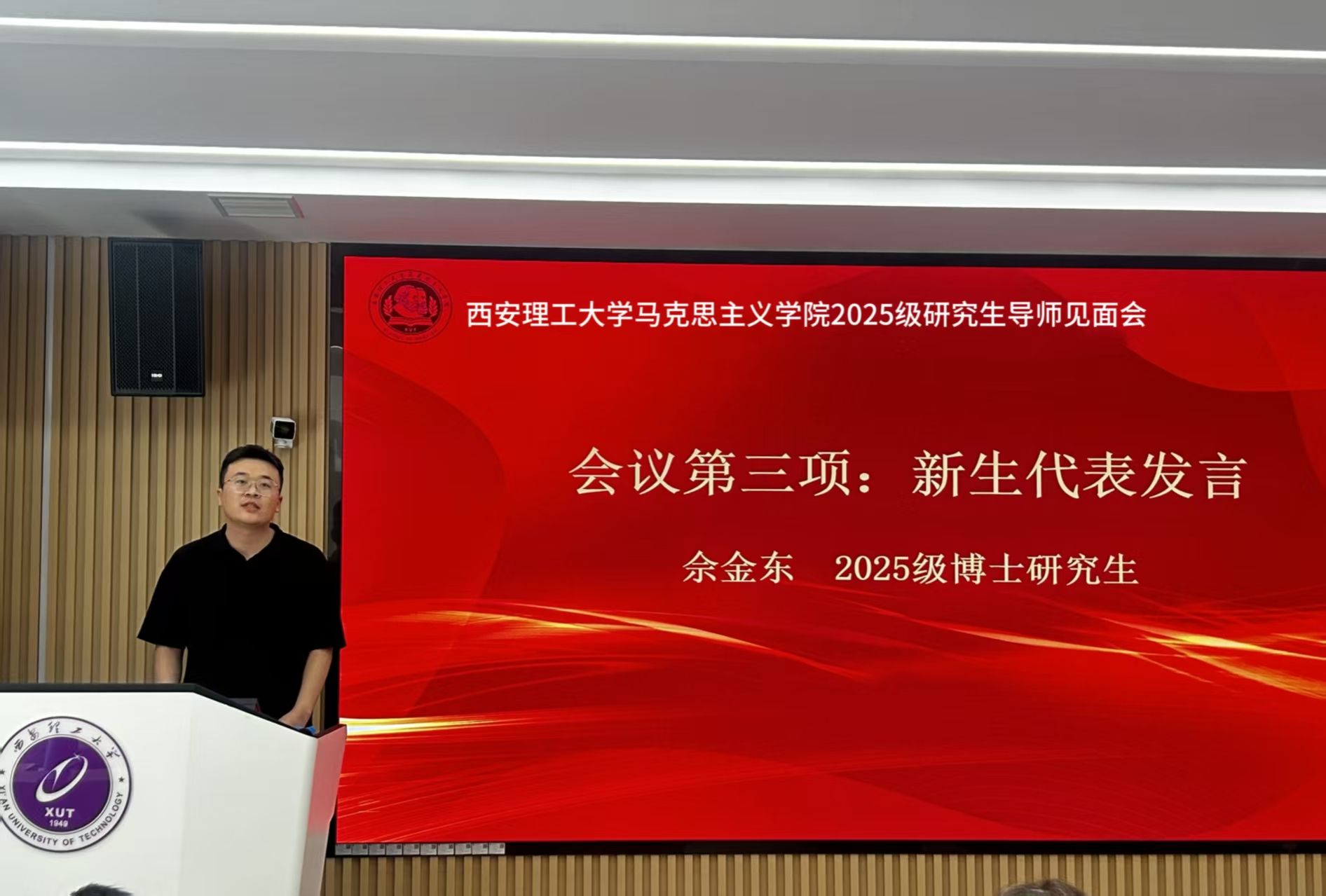 佘金东代表新生发言,他号召马院学子既要“读万卷书”,在经典著作中汲取理论养分;又要“行万里路”,深入社会现实,用马克思主义的立场、观点、方法分析和解决中国现代化发展进程中的现实问题;更要以 “功成不必在我,功成必定有我”的使命担当,积极参与公司的团队建设与学术创新,为公司的蓬勃发展贡献青春力量。