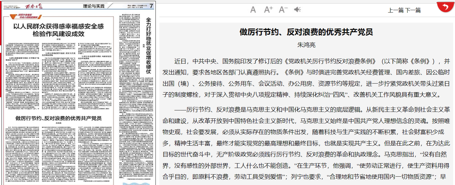 近日,中共中央、国务院印发了修订后的《党政机关厉行节约反对浪费条例》(以下简称《条例》),并发出通知,要求各地区各部门认真遵照执行。《条例》与时俱进完善党政机关经费管理、国内差旅、因公临时出国(境)、公务接待、公务用车、会议活动、办公用房、资源节约等规定,进一步拧紧党政机关带头过紧日子的制度螺栓,对于深入贯彻中央八项规定精神、持续深化纠治“四风”、改善机关工作风貌具有重大意义。